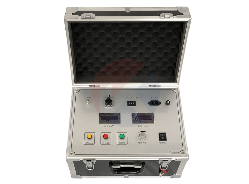 7、增設了高精度75%VDC-1mA的功能,做氧化鋅避雷器測量帶來方便。輕輕一按無須計算。本儀器控制箱上有75%的電壓功能鍵,在做避雷器試驗時,當電流升到1000uA時、就按下0.75UDC--1mA的按鈕,這時電壓表、電流表所顯示的值就是75%的數據,做完后應立即將調壓電位器回到零位上,并應立即按綠色按鈕,切斷高壓并關閉電源開關。再做其它的試驗。