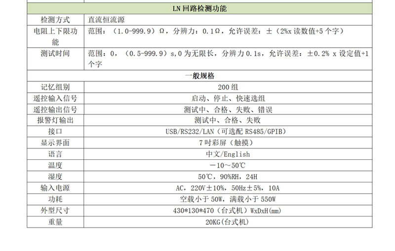 f)多項支持:LN回路測試、開路偵測功能、快速啟動測試、電弧測試;