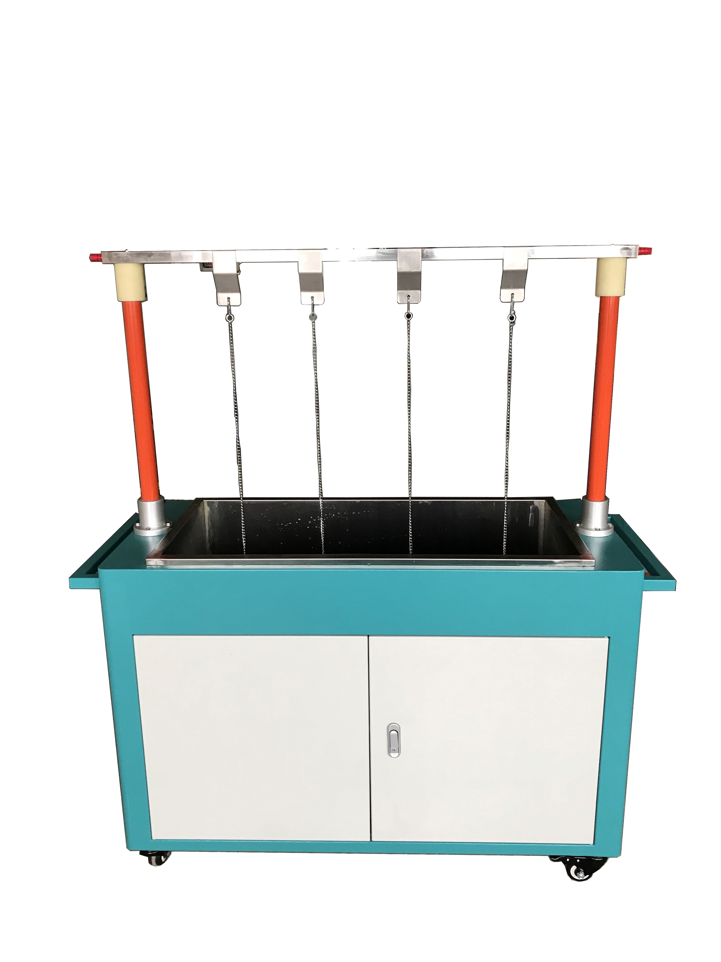 Reke02引流線試驗裝置是根據(10V帶電作業的工器具預防性試驗標準)為依據研制而成。本裝置采用不銹鋼水槽,可同時進行2組引流線(載流線)進行耐壓試驗。